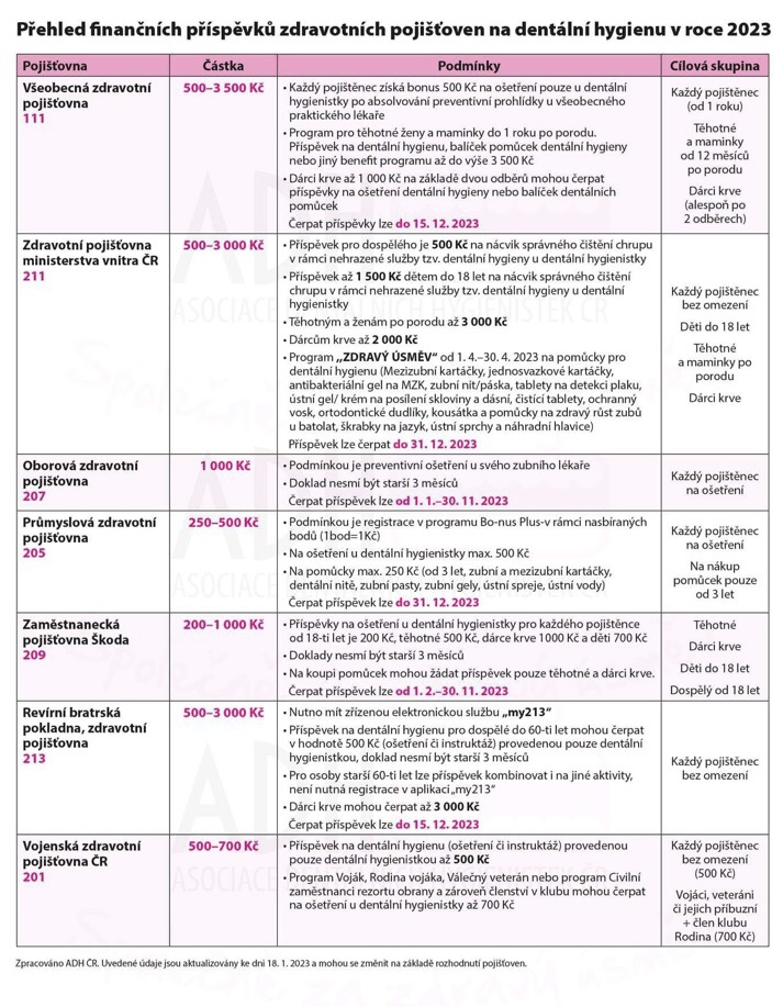 AKTUALITY Příspěvky na dentální hygienu pro klienty zdravotních pojišťoven v roce 2023 Zpracováno podle podkladů ADH ČR